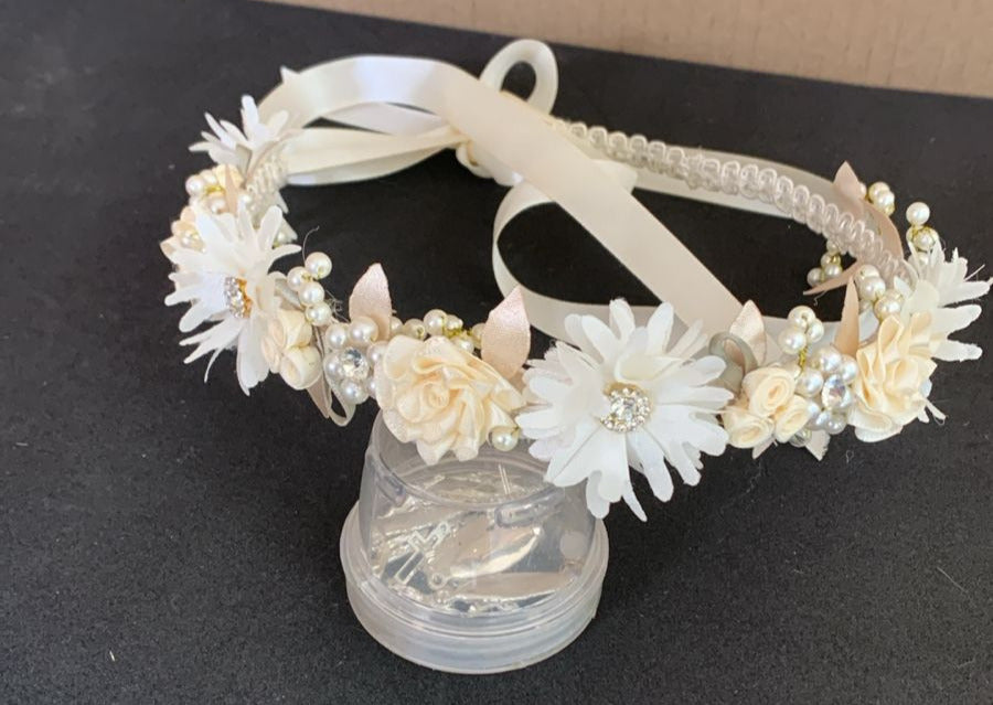 Esta hermosa tiara de flores es perfecta para complementar cualquier atuendo de bautizo o primera comunión. Hecha con delicadas flores, esta tiara es ideal para sujetar tu cabello y darle un toque de elegancia a tu look. ¡Impresiona a todos con esta joya única en tu próxima ocasión especial!